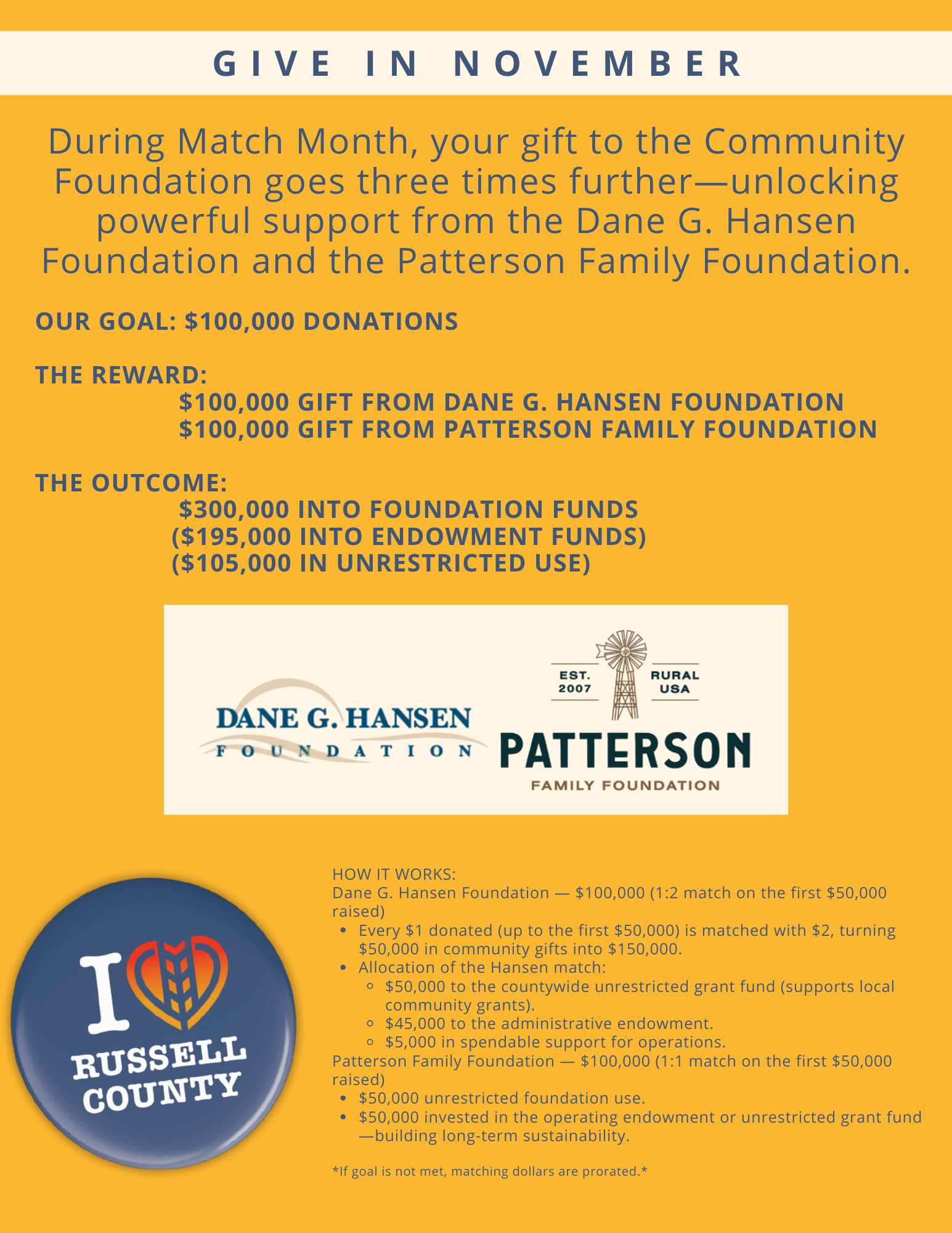 November is Match Month for Gove County Community Foundation, Norton County Community Foundation, Russell County Area Community Foundation, and Sheridan County Community Foundation!